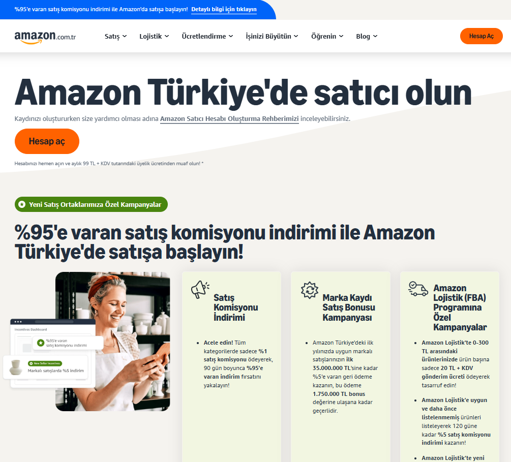 Amazon’da satıcı hesabı açmak oldukça basittir. Amazon Türkiye satıcı paneline girerek e-posta adresinizle başvuru yapabilirsiniz. Başvuru sırasında şirket bilgileri, kimlik doğrulama ve banka hesap bilgileri sisteme girilir. Amazon, güvenlik ve doğrulama süreçlerine büyük önem verdiği için bilgilerinizin eksiksiz ve doğru olması oldukça önemlidir. Hesap açmak için buraya tıklayabilirsiniz.