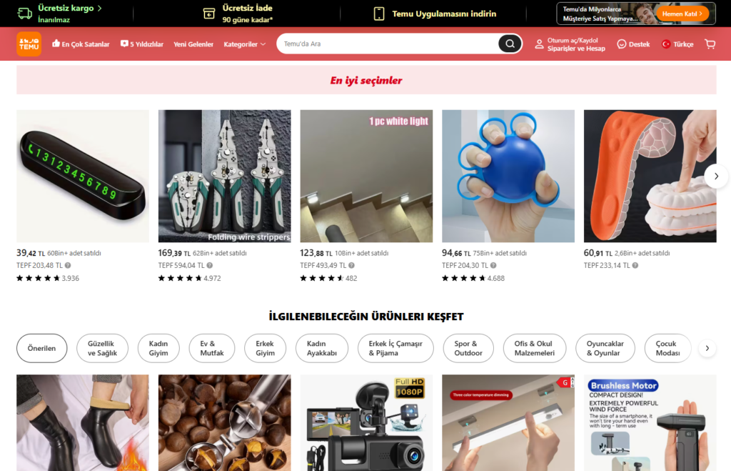 Platformda elektronik ürünlerden giyime, ev eşyalarından kişisel bakım ürünlerine kadar binlerce farklı kategori bulunur. Temu’yu benzer platformlardan ayıran en önemli özellik, fiyat odaklı bir iş modeli benimsemesi ve sürekli indirim kampanyaları ve promosyonlar sunmasıdır.